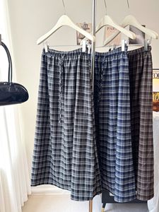 松紧腰格纹A字裙女2025秋季新款高腰抽绳百搭显瘦休闲抽绳半身裙