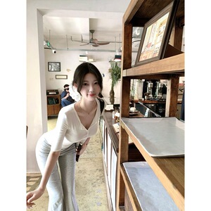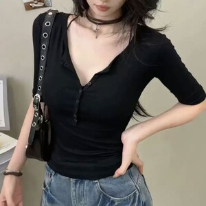 美式辣妹v领短袖T恤女装新款秋季纯欲风收腰修身显瘦内搭上衣现货