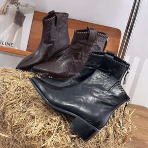 Monica2025手抓纹牛皮尖头粗跟短靴复古马丁靴西部牛仔靴5076-01