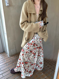 im向 重磅~针织中长款粗针大翻领毛衣外套+刺绣花朵半裙
