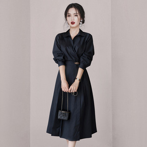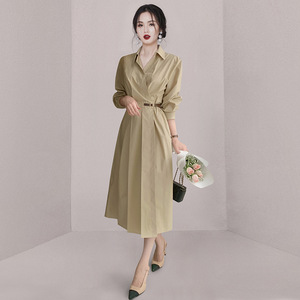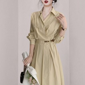 跨境气质时尚连衣裙2025秋季新款翻领收腰显瘦压褶设计感A字裙女