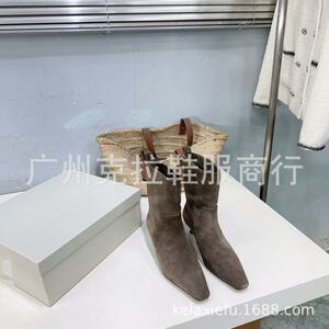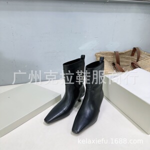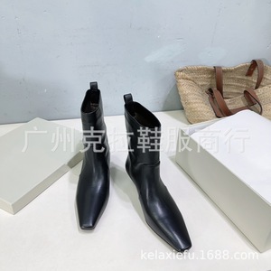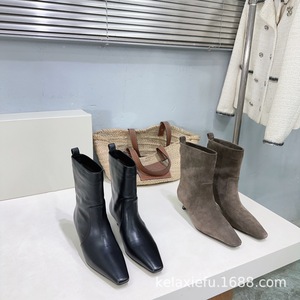 高定2025秋冬时髦简易小方头真皮尖头高跟短靴显瘦时装单靴了裸靴