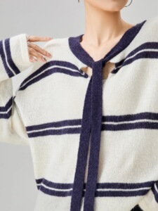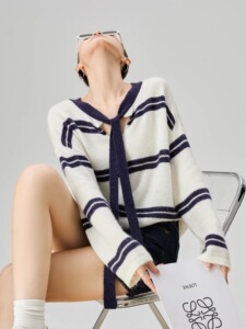 前后两穿马海毛撞色条纹系带长袖针织衫上衣女韩系早秋季穿搭小众