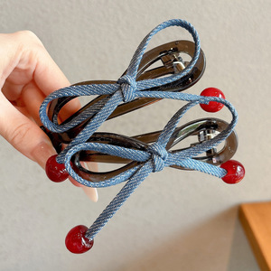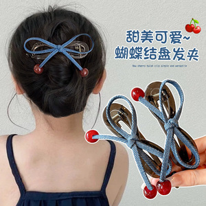 高级牛仔蓝樱桃蝴蝶结发夹儿童可爱后脑勺盘发鲨鱼夹高级感发饰女