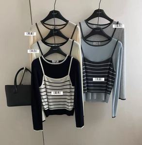 撞色条纹吊带两件套针织衫女秋季圆领气质打底衫修身长袖T恤上衣