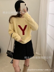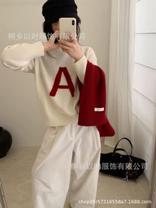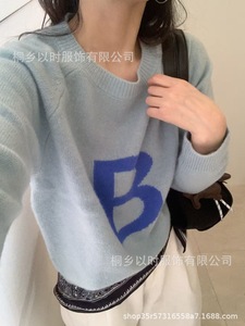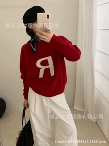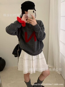 以时 秋冬新品韩系文艺款字母羊毛衫女圆领宽松100全羊毛套头女装
