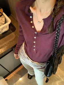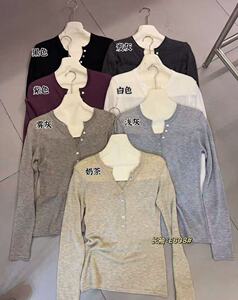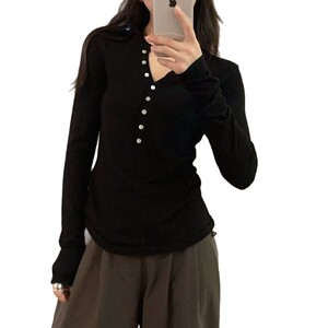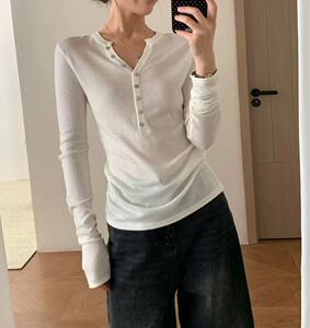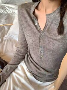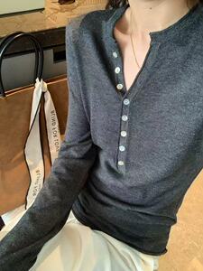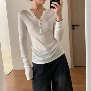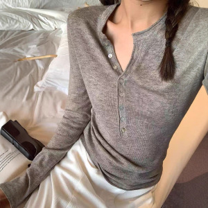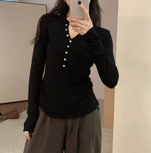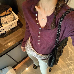 韩系设计感半开v领长袖针织衫女2025早秋修身显瘦内搭纽扣打底衫