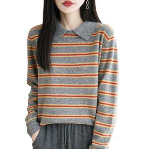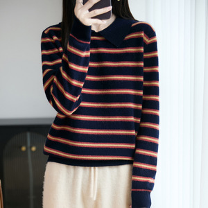 翻领条纹polo领纯羊毛针织衫女小众复古港味秋冬新款女装打底上衣