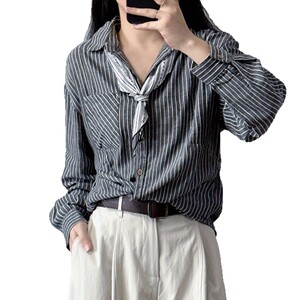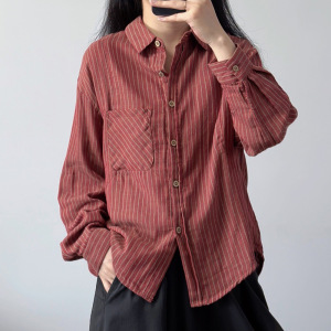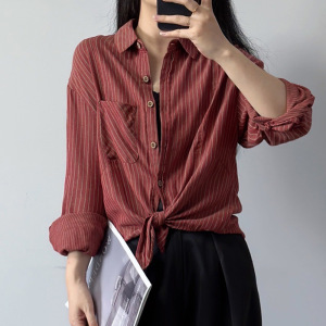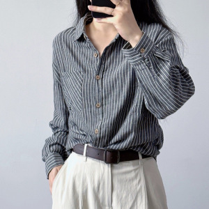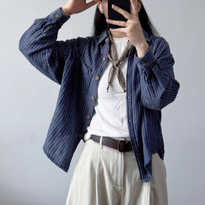港风复古条纹衬衫女棉质长袖上衣春秋宽松大码休闲衬衣外套