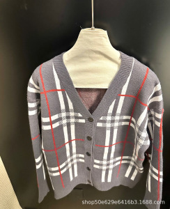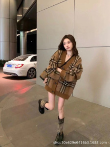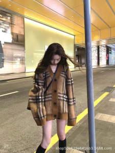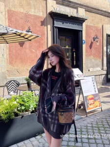 老钱风复古领格子马海毛毛衣外套女秋冬设计感中长款针织开衫上衣
