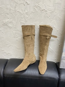 2025春秋新款小众设计感杏色绒面骑士靴方头低跟皮带扣长靴高筒靴