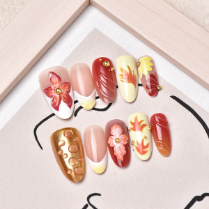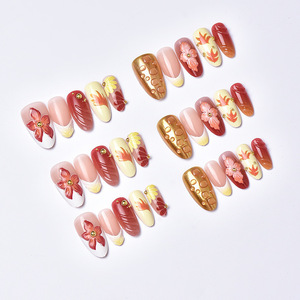 30片跨境新款热销秋冬款精品鎏金穿戴甲手工点钻花朵法式美甲甲片