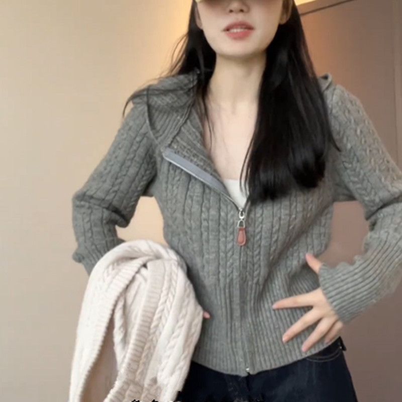 小香风连帽卫衣针织开衫女秋冬软糯麻花打底上衣短款毛衣外套