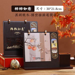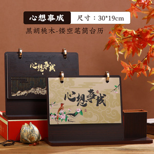 2026年木质台历复古创意多功能笔筒商务台历摆件厂家批发LOGO定制