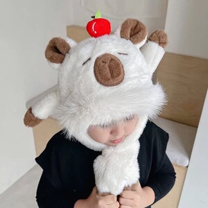会动卡皮巴拉儿童帽子围巾一体冬季宝宝护耳毛绒帽男女童雷锋帽萌