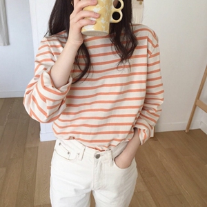 大码宽松棉长袖t恤女2025年秋季爆款韩版百搭条纹体恤休闲上衣