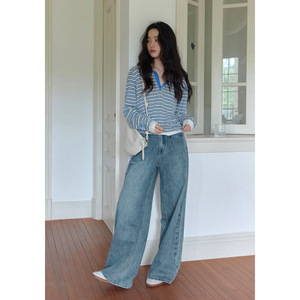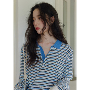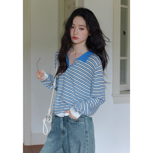 1313撞色polo翻领蓝白条套头羊毛针织衫2025女秋层次感宽松薄毛衣
