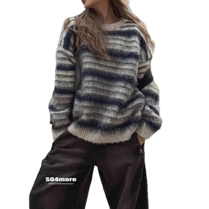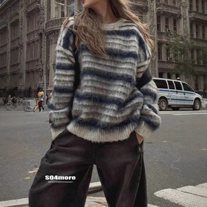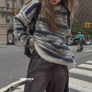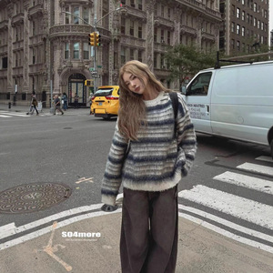 锦柔触感 山羊绒拉绒圆领条纹拼色 圆领宽松拉绒工艺长绒绒