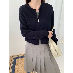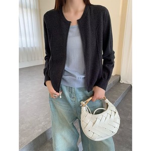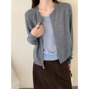 时尚有型线条拼接针织开衫秋冬新款女装宽松拉链圆领纯色外套