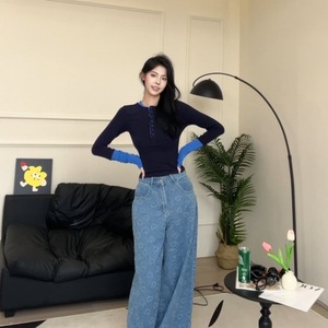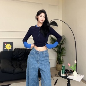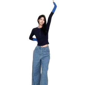 【人棉】撞色拼接长袖T恤女早秋2025新款修身设计感小众打底