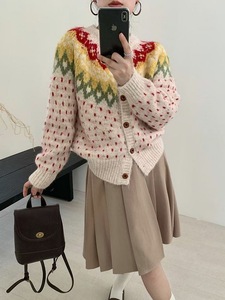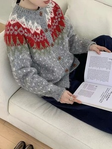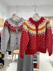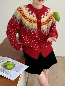 韩系费尔岛撞色提花红色毛衣外套女秋冬新款宽松百搭针织开衫1300