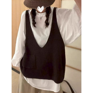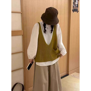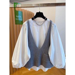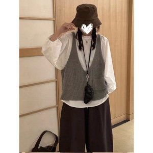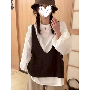 2025秋季新款宽松长袖圆领衬衫上衣叠穿针织马甲女氛围感两件套装