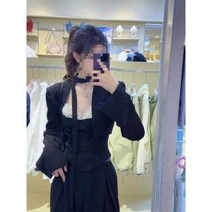 春夏季一整套新品感短款黑色西装外套抹胸上衣休闲阔腿裤套装裤子