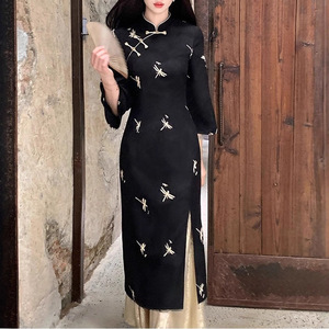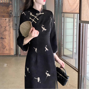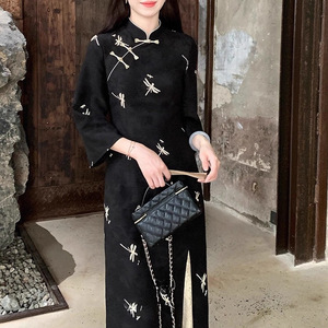2025年【墨云秀】新中式蜻蜓绣花拼接旗袍女早秋提花连衣裙