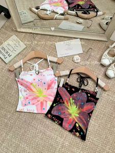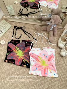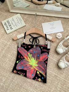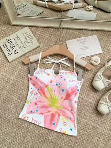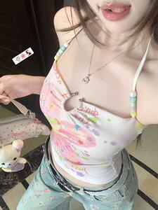 949#人棉夏季新款纯欲花朵印花串珠挂脖背心修身一体式带胸垫上衣