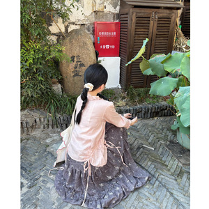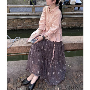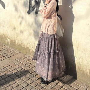 MENGXIANG 复古温柔女装深灰色花朵刺绣大摆量半身裙全松紧腰长裙