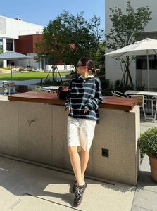 瀚柯 AT 复古通勤 经典彩色条纹polo衫宽松纯棉长袖T恤