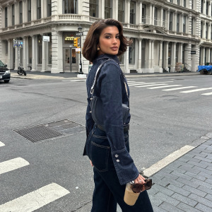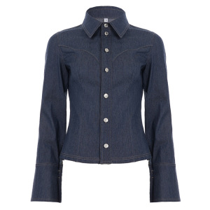 跨境街头辣妹风简约纯色牛仔分割设计收腰复古衬衫气质通勤上衣女
