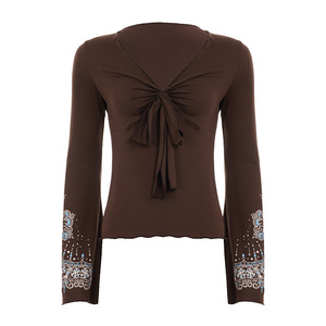 外贸复古vintage小众印花喇叭长袖T恤绑带蝴蝶结褶皱修身显瘦上衣