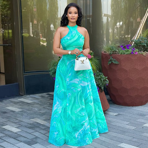 欧美风ins外贸优雅女装通勤印花街头A字裙圆领褶皱无袖长款连衣裙