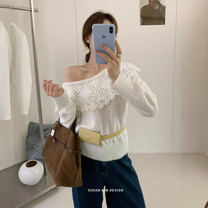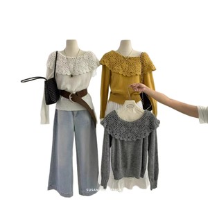 跨境东南亚女韩版早秋新款净色针织复古镂空格子翻领休闲长袖毛衣