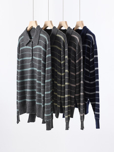 老钱风高级感翻领羊毛针织衫上衣女宽松polo领长袖条纹毛衣外套女