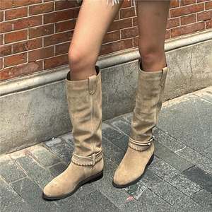牛皮版~流浪风小众磨砂皮骑士靴女流苏平底设计感外穿沙漠西部靴