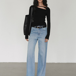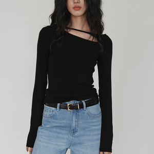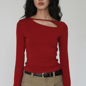 红色单侧挖空长袖上衣女设计感小众春季显瘦打底T恤