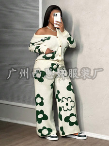 休闲简约V领长袖开襟外套+阔腿裤绿色花卉针织套装女士毛衣两件套