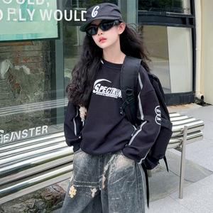 美式复古运动卫衣女童2025秋季新款宽松显瘦设计感上衣牛仔裤套装