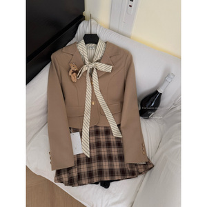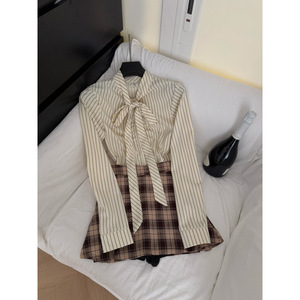 塞纳藤校学妹蝴蝶结绑带条纹长袖衬衫格纹半裙套装2025秋季新款