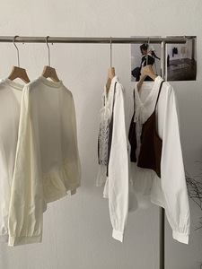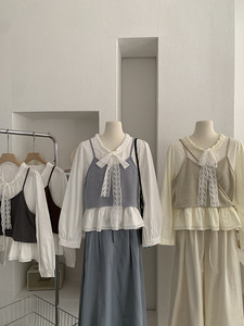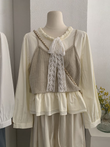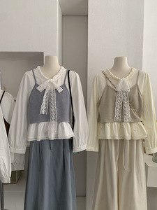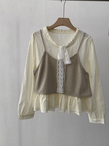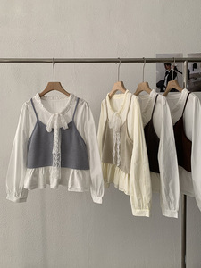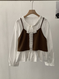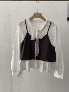 欧玛莱 蕾丝蝴蝶结系带长袖衬衫早秋宽松显瘦假两件叠穿上衣 4761