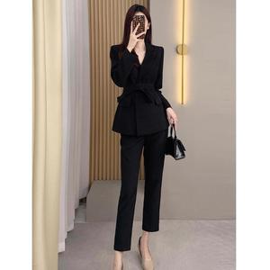 气质职业黑色西装套装女2025秋季新款欧美气质通勤系带西服两件套