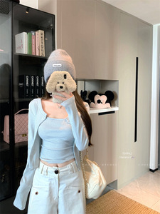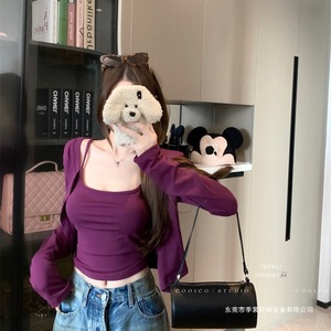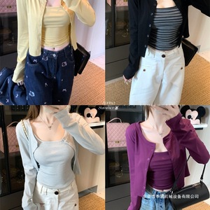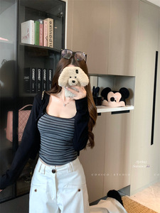 慵懒复古黑色长袖开衫外套女秋季套装修身条纹吊带背心上衣两件套