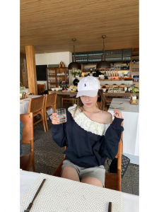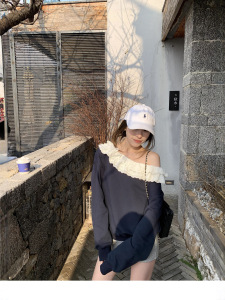 韩女法则 藏青色斜肩卫衣女2025新款蕾丝花边小众长袖上衣