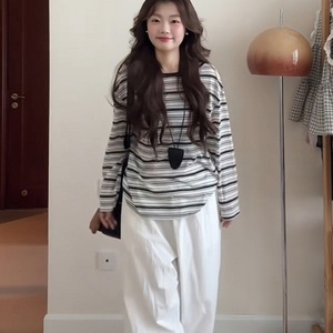韩系黑色条纹防晒罩衫长袖T恤女早秋慵懒宽松miu系空调衫薄款上衣