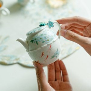 中式岩矿白纯手绘蓝星花陶瓷茶壶带提溜高档泡茶精致家用功夫茶具