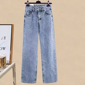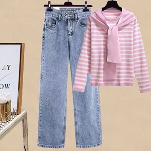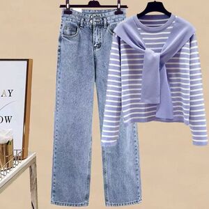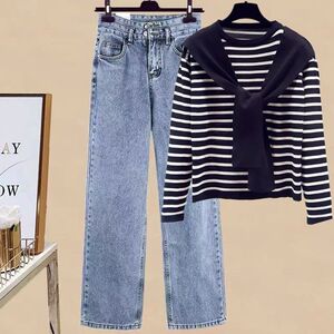 单件/套装2025新款春秋学院风针织衫女+高腰减龄牛仔裤两件套女