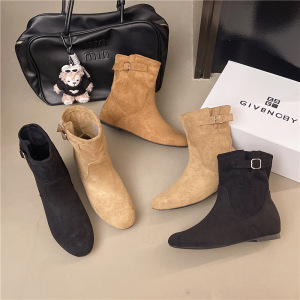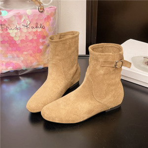 2025秋季新款女靴百搭舒适坡跟机车靴扣带马丁靴潮中筒靴