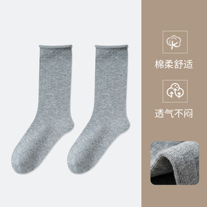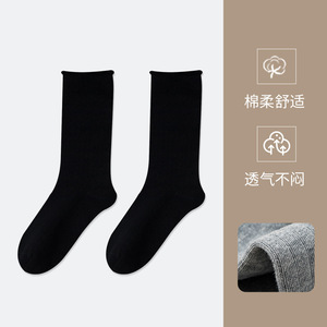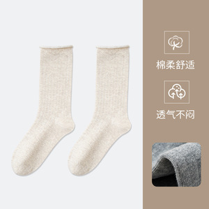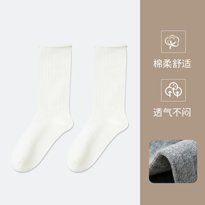 白色卷边袜子女纯棉中筒袜ins秋冬日系jk抽条学生长袜无骨月子袜